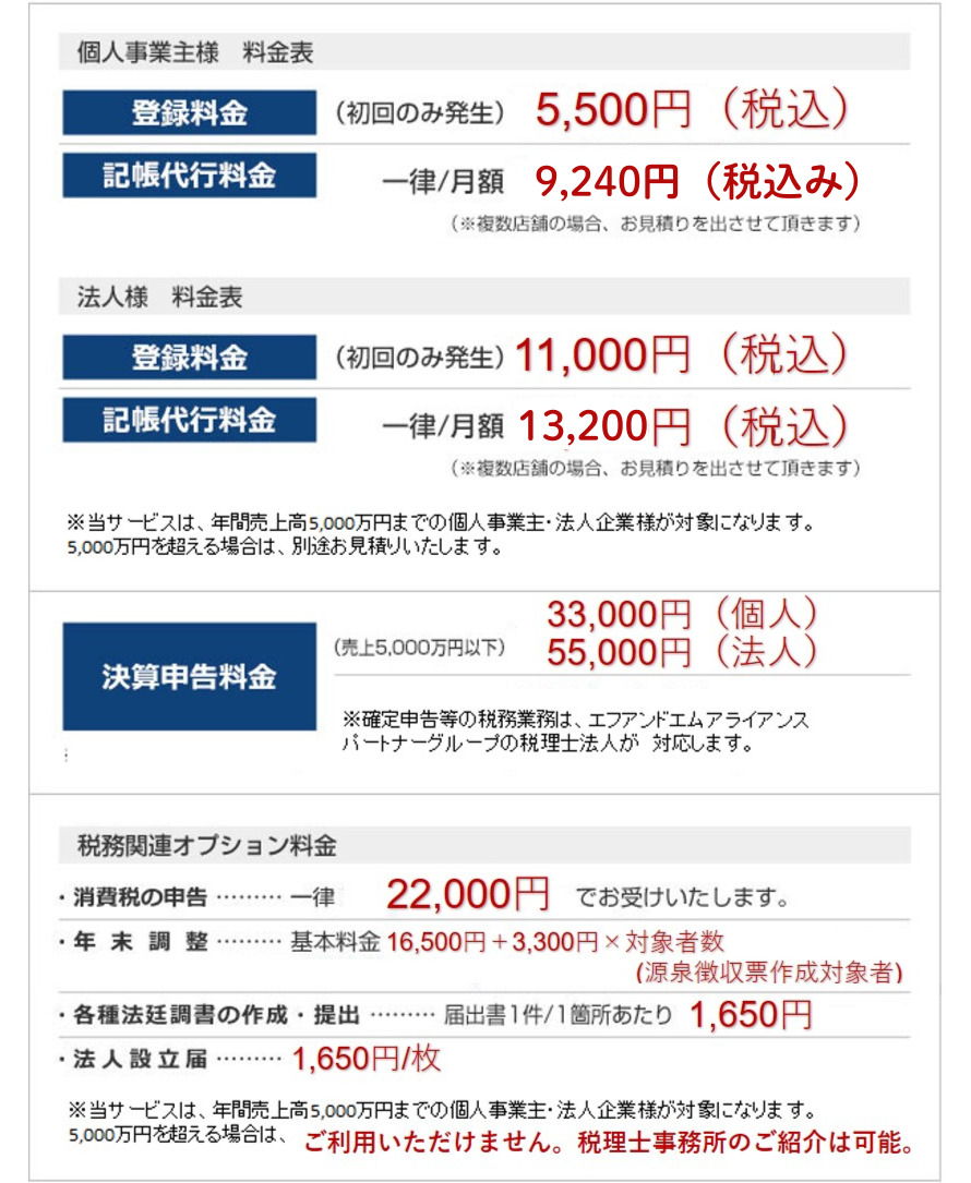 申込金(初年度のみ)5,500円+記帳料(月間9,240円×12カ月)+所得税申告料33,000円=149,380円